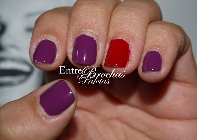 El rojo es el 240, un tono que se me había antojado desde que en navidades lo probé porque lo tenía mi prima Alicia (un beso guapa!), el morado es el 316, el color que acompaña mis uñas de los pies en el último mes porque me ha dado por ese color y combina con lo que sea. Me las estoy pintando de ese tono una y otra vez.