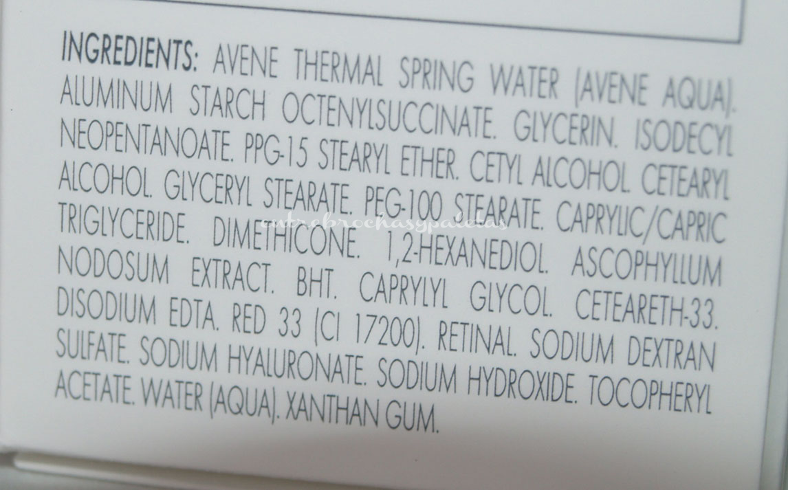 Al tratar algo más específico está especialmente indicado para utilizar por la noche. Os dejo los ingredientes destacando, porque me ha llamando la atención, que lleva también un poquito de agua termal, retinol y ácido hialurónico. Sobre el retinol, me consta que es el culpable de lo bien que me funciona, el otro contorno que os dejaba entrever al principio también lo llevaba (y tengo pendiente hablaros de él aunque lo terminé hace siglos). Ambos son agradables de utilizar y no como me sucedió con el de Christian Breton, un auténtico chasco.
