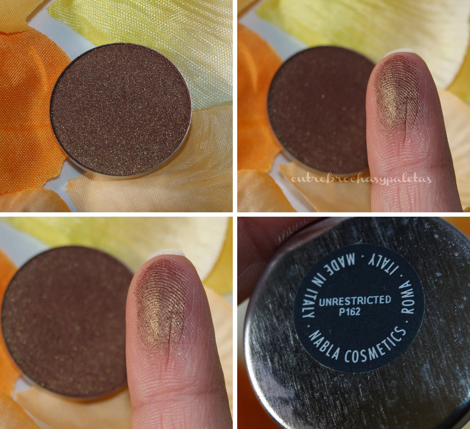 La más complicada a la hora de fotografiar porque en persona es ¡impresionante! ¿Cómo describir Unrestricted? Se trata de un marrón con tintes rojizos que tiene pequeñas chispas de dorado, a esta me refería en particular cuando antes os comentaba que hay sombras que dependiendo de con que o como se trabajen dan unos u otros matices.
