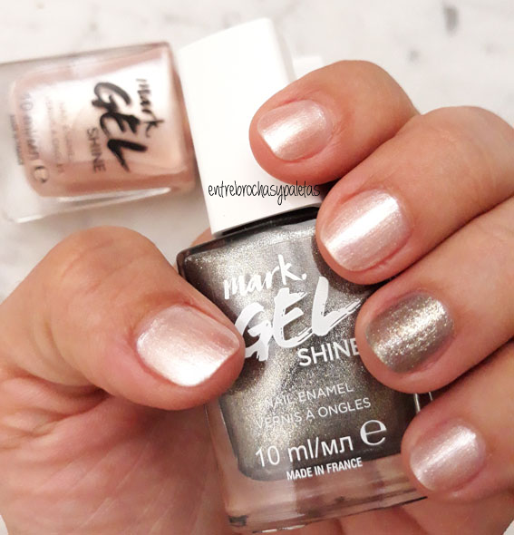 La segunda propuesta es similar, he jugado con el tono perfect light, dentro de los celestiales con un punto salmón, añadiendo un toque distinto en el anular con sparkle lens, una especie de gris de acabado brillante. Todos ellos se retiran sin problema con cualquier quitaesmalte.