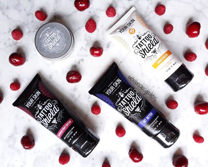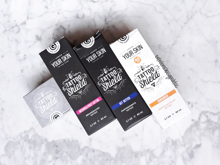 Tattoo Shield es una marca diseñada y formulada en EEUU pero fabricada en España, lo que más me ha llamado la atención es la formulación, después os mostraré la del abrillantador de color. Su gama cuenta con cuatro productos, el que os acabo de mencionar, un protector solar específico, una crema para curar y otra de mantenimiento.