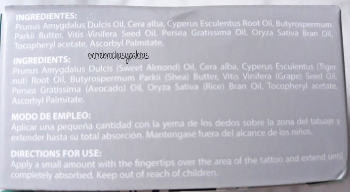 Hay que aplicar muy poca cantidad, en la imagen veis mi tatuaje tras una aplicación excesiva, simplemente con manchar los dedos tendríamos suficiente para esa superficie. Es cómodo de masajear y la piel lo absorbe, no deja sensación pringosa. Siempre que hidrato se recupera el tono “original”, es agradable de utilizar.