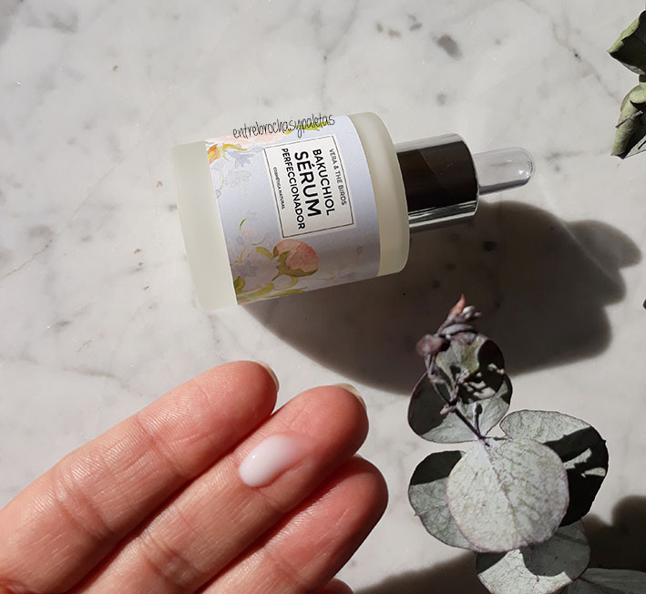 Llevamos una temporada en que el retinol se ha puesto de moda hasta lo innombrable, pasa a veces con algunos componentes. Mi experiencia es pequeña pero positiva, habré utilizado dos o tres cosméticos que lo lleven, pero no siempre se puede usar o no todas las pieles lo toleran. Conocer que Vera and the Birds ha encontrado una alternativa natural en el Bakuchiol me ha parecido la mar de interesante, este sérum lleva un 1% y, a diferencia del retinol, no es fotosensibilizante. Indican que se puede utilizar mañana y noche, en mi caso lo he dejado para la rutina nocturna dejando de lado los aceites que suelo alternar para ver el resultado por si mismo.