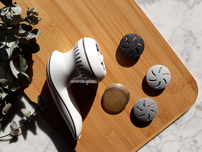 De los cabezales tenemos recambios (5.75 € el pack de los tres), suelo usar el intermedio y me va bien, curioso es que tiene un sistema de aspiración, luego desarmamos y limpiamos el aparato, pero no se nos queda todo el suelo perdido de pieles muertas (si queda es poquito). Importante que no hay que sumergirlo en agua, usamos el pincelín que trae y listo.